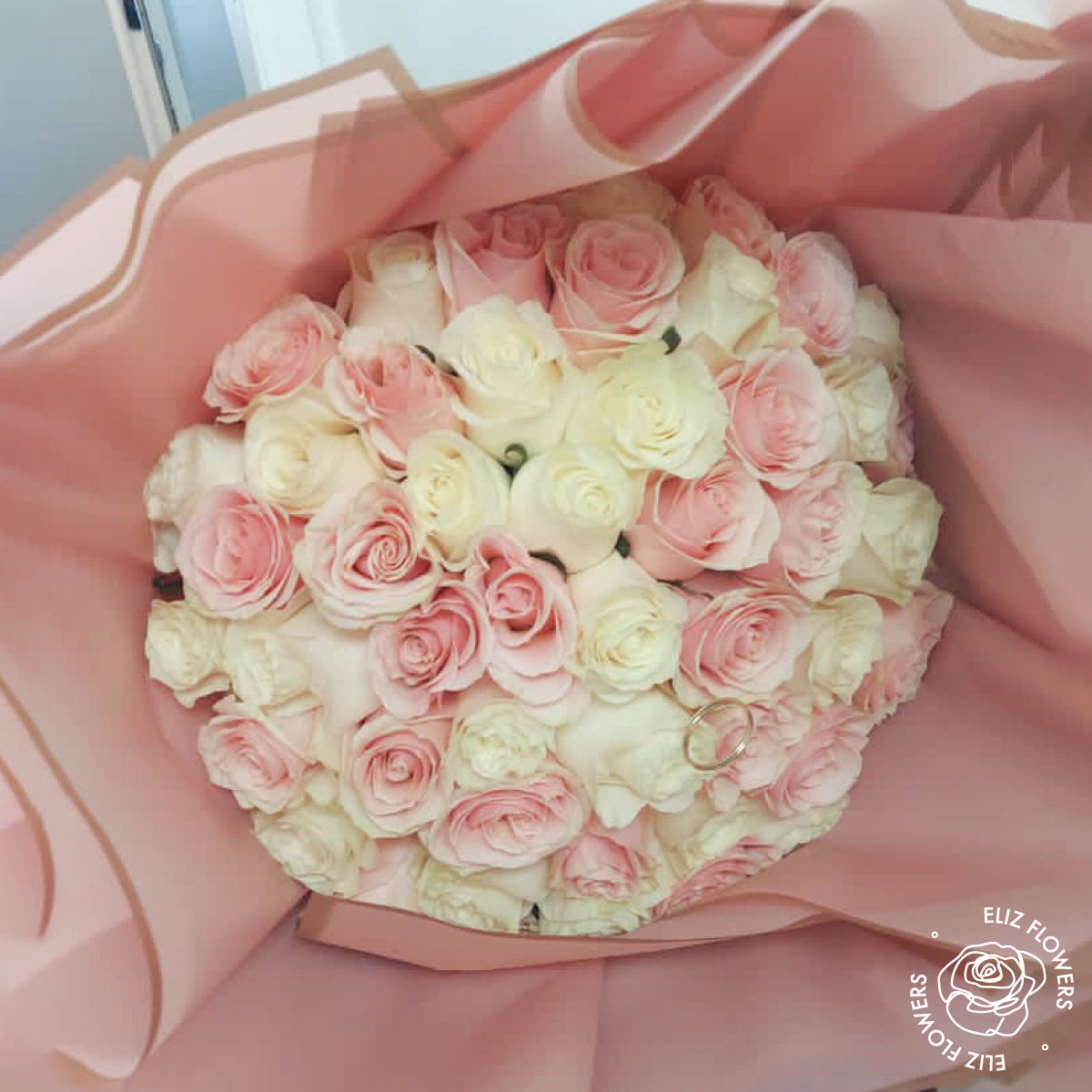 Elegant and timeless, this bouquet of soft pink and white roses is made for love-filled moments.